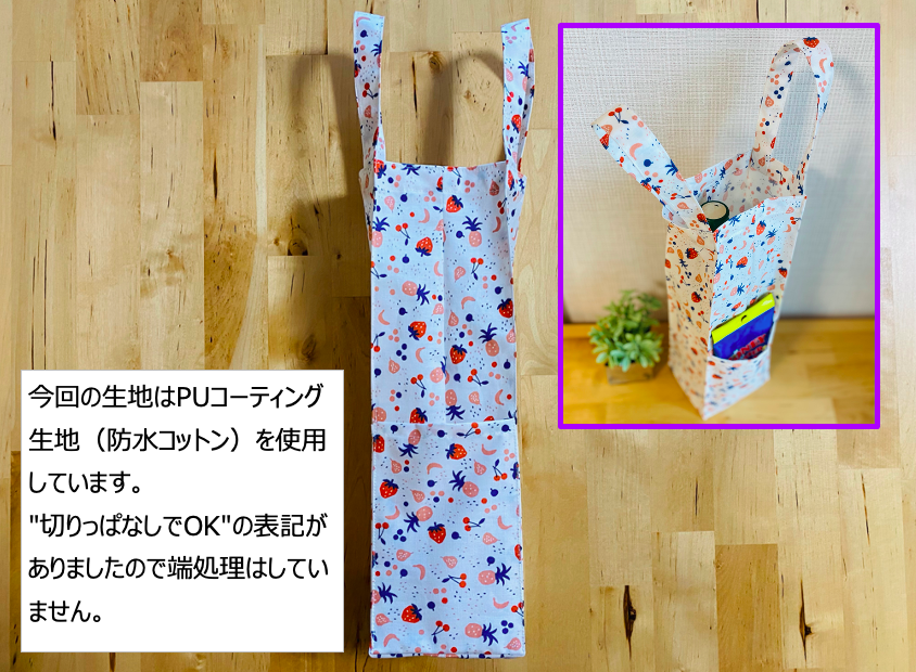 生地を探していたところこの防水加工のしてある生地がカチッとしているのに普通のハサミで裁断できてミシンでコットン生地を縫うように縫えるということで購入し作ってみたところ自立する理想通りのバッグができました![]()