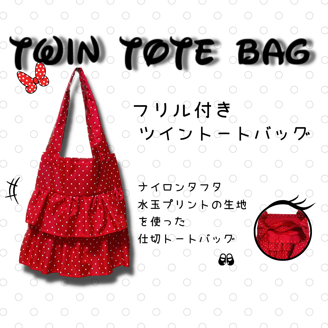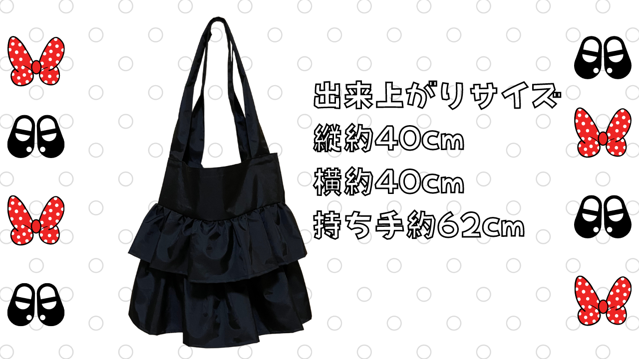 2023年02月23日 仕切トートバッグ作り方 仕切ポケット付きツイントートバッグ ぺたんこフリル付き フリルトートバッグ コメント数:0 コメント カテゴリ:ハンドメイド説明動画あり by ちくちくパーク 3月2日はミニーの日という事でミニーちゃんをイメージしたフリルバッグを作りました 明るい色柄で作るとカジュアルな可愛らしさが引き立ちシックな色柄で作ると大人可愛いバッグになります 春のお出かけにおすすめですナイロンタフタの生地ミニーちゃん柄で普段サイズを作り、ブラックで大きめサイズを作りました大きめサイズの詳細はこちらです(ドット柄サイズは動画内でご確認ください)出来上がりサイズ 生地のサイズフリル側本体① 縦61cm 横42cm② 縦14cm 横42cm③ 縦15cm 横42cmフリル上段 縦15cm 横80cm下段 縦19cm 横80cm本体内側縦86cm 横42cm持ち手縦12cm 横70cm×2内ポケットは20cm×20cm持ち手を半分に折って縫う長さはお好みですがおすすめは30cmくらいです。(動画12:11)大きめはガバッと開くのでフリル側にスナップボタン等を付けると安心なのでおすすめです